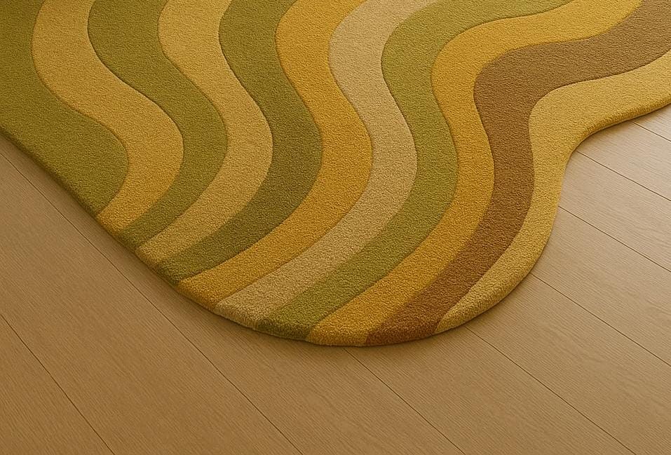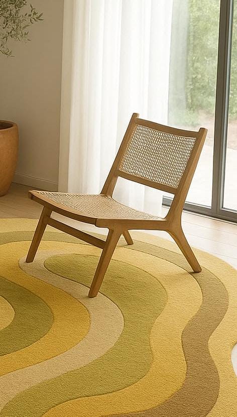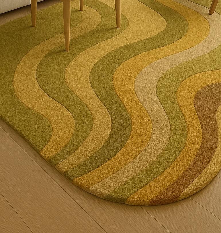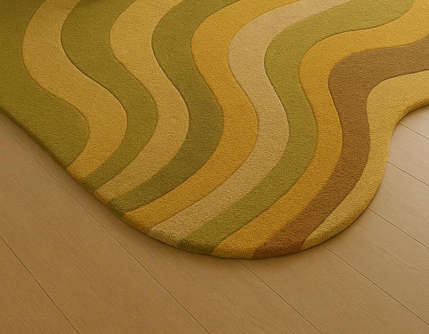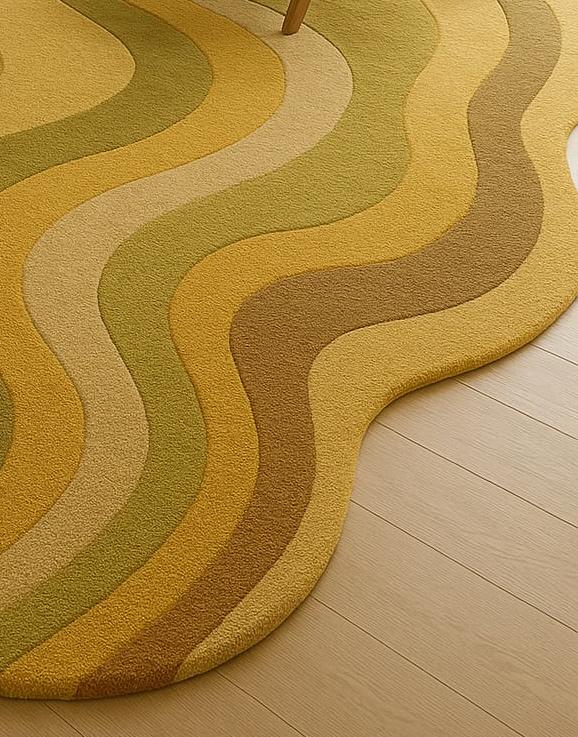 Bring warm, modern style to your home with this hand-tufted 100% wool rug, designed in a beautiful wavy pattern with calming hues of yellow, olive green, mustard, and beige. Its irregular organic shape adds a unique artistic touch perfect for modern, boho, Scandinavian, or retro-inspired interiors.