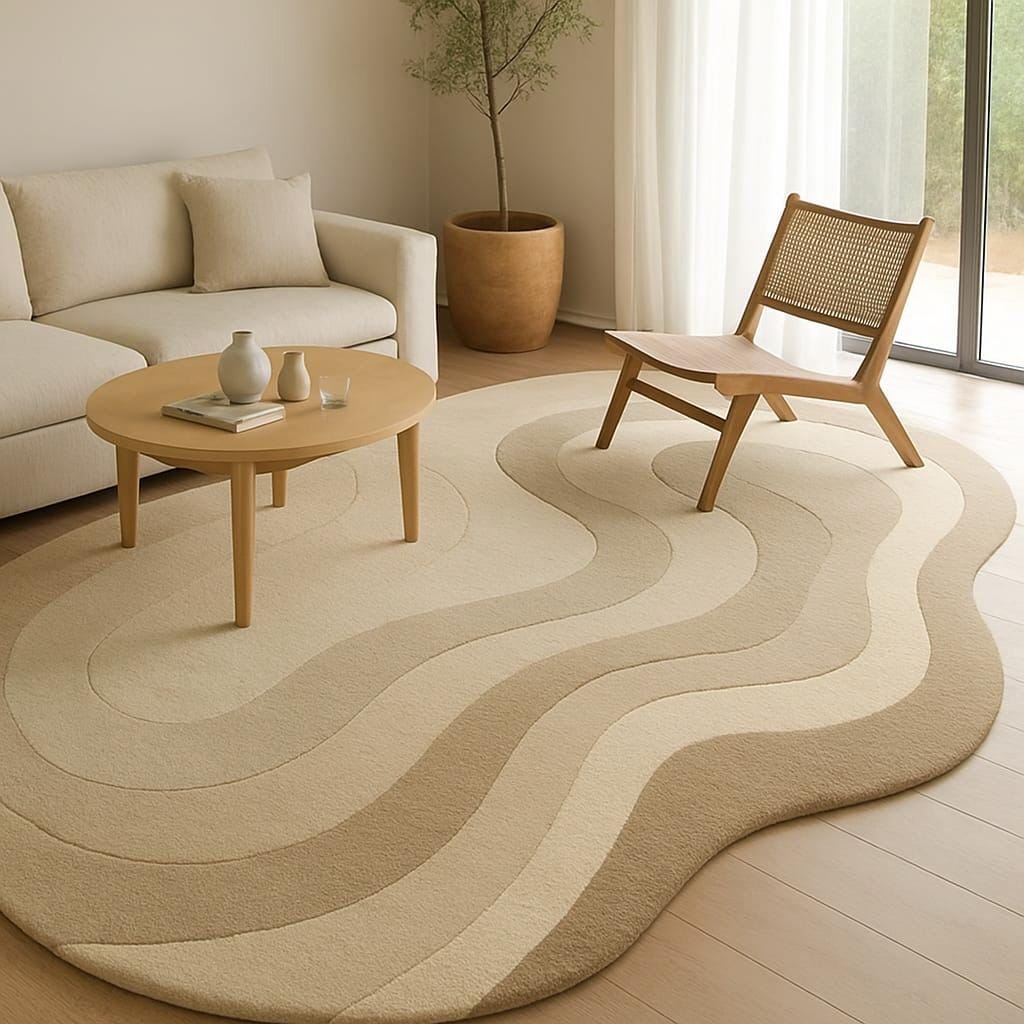 Handcrafted from 100% premium wool, this rug offers durability, comfort, and a luxurious underfoot feel. The artistic wave pattern adds movement and warmth, creating a calm and inviting atmosphere.