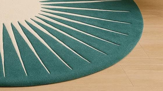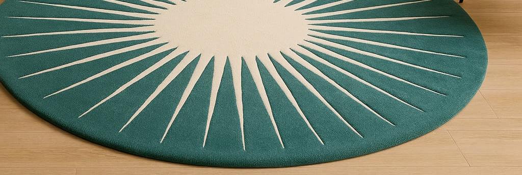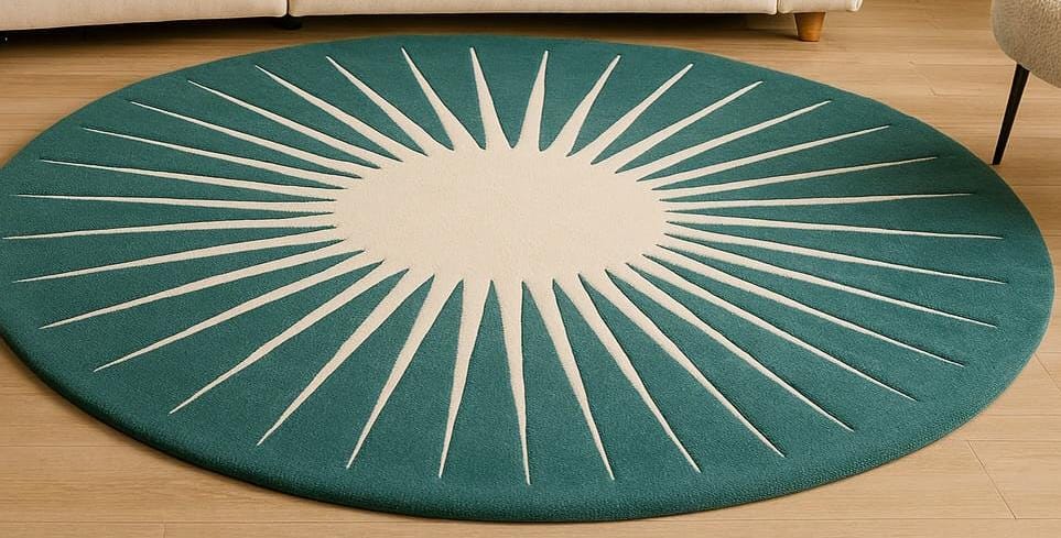 Elevate your living space with this beautifully crafted hand-tufted wool rug, featuring a striking sunburst/starburst pattern in elegant teal and cream tones. Made from 100% premium wool, this round rug adds warmth, softness, and a modern artistic touch to any room.
