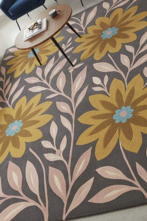 Bring warmth, color, and modern elegance to your home with this beautifully Hand-Tufted Wool Floral Rug. Featuring large golden-yellow flowers, soft pink botanical leaves, and a charcoal grey background, this rug adds a stylish and artistic touch to any living room, bedroom, or lounge space.