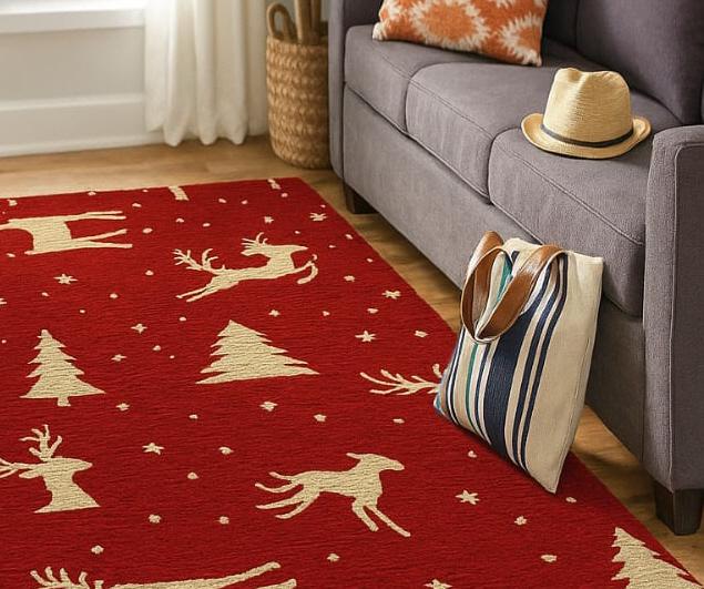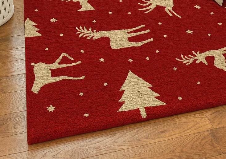 Transform your home into a cozy winter retreat with this Hand-Tufted Wool Christmas Rug, designed with elegant reindeer, pine trees, and falling snowflakes on a rich festive red background. Crafted from 100% premium wool, this rug brings warmth, softness, and holiday charm to any room.