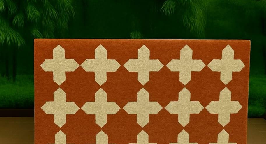 • Material: 100% Natural Wool • Technique: Hand Tufted • Design: Geometric / Cross Motif • Colors: Terracotta Orange & Ivory • Pile Height: Medium pile (soft & comfortable) • Backing: Cotton backing (can be customized) • Origin: Handmade in India