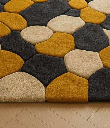 Bring a modern and artistic touch to your home with this hand tufted wool rug, designed in a unique abstract pebble pattern. Crafted by skilled artisans, this rug features a rich combination of mustard yellow, charcoal grey, and cream tones, creating a warm and contemporary feel.
