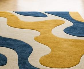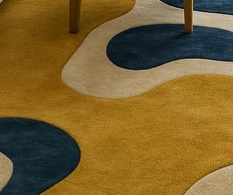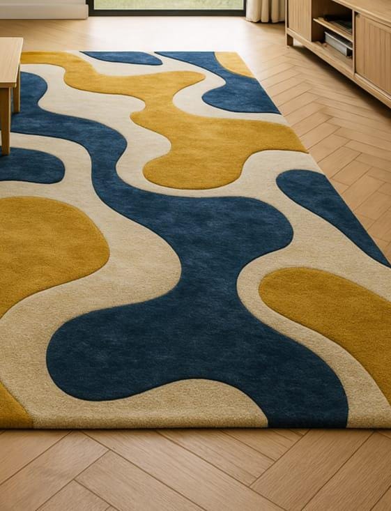 Upgrade your home with this hand tufted wool modern abstract wave area rug, designed to bring warmth, movement, and style to contemporary interiors. The flowing wave pattern with mustard yellow, deep navy blue, and soft beige tones creates a balanced and eye-catching look.