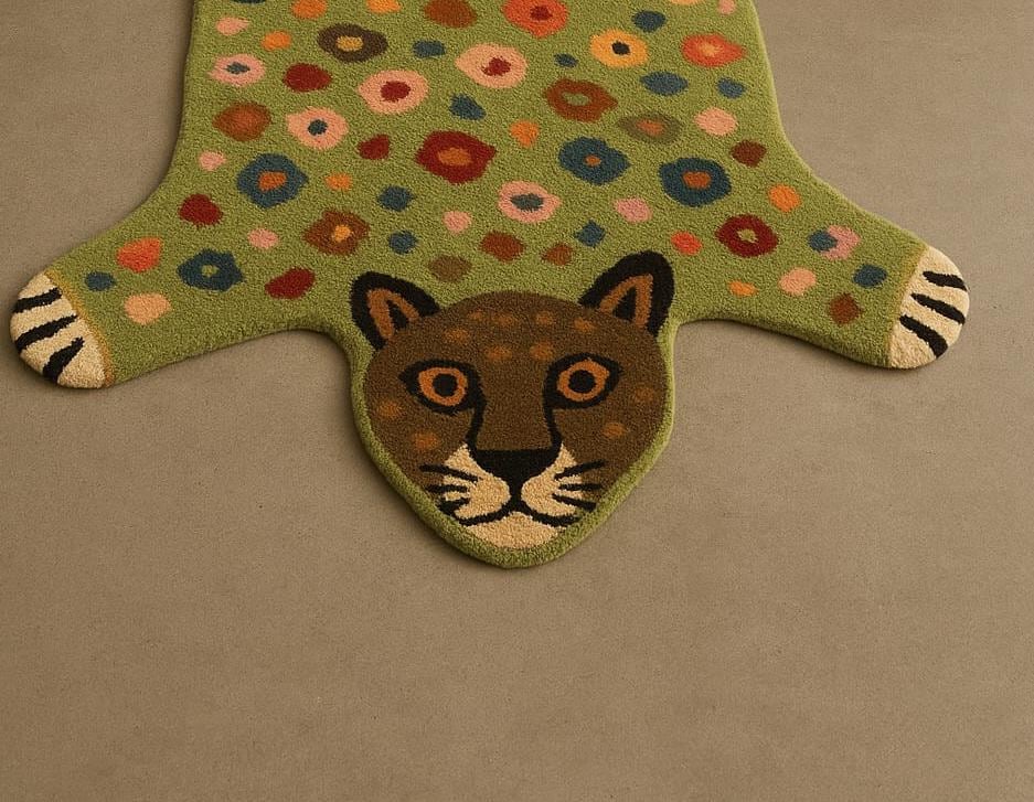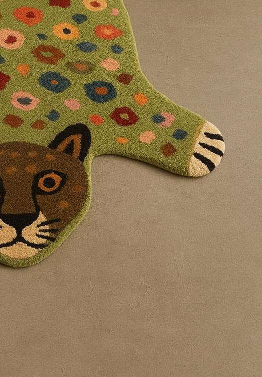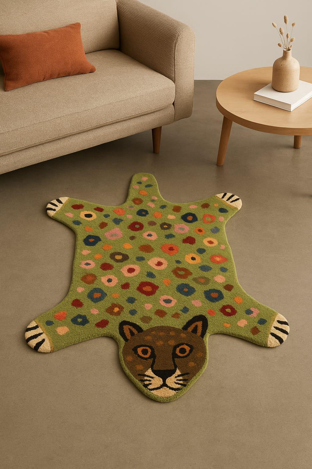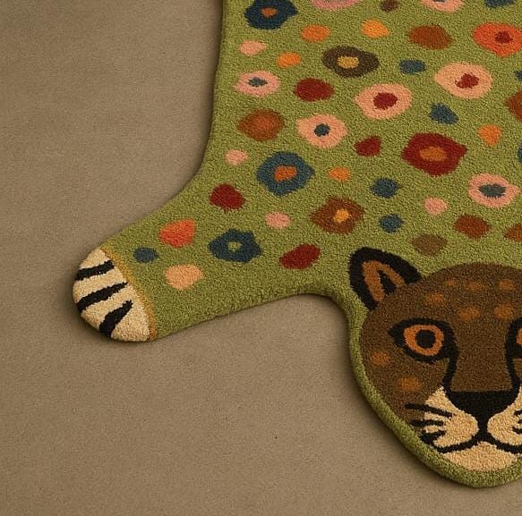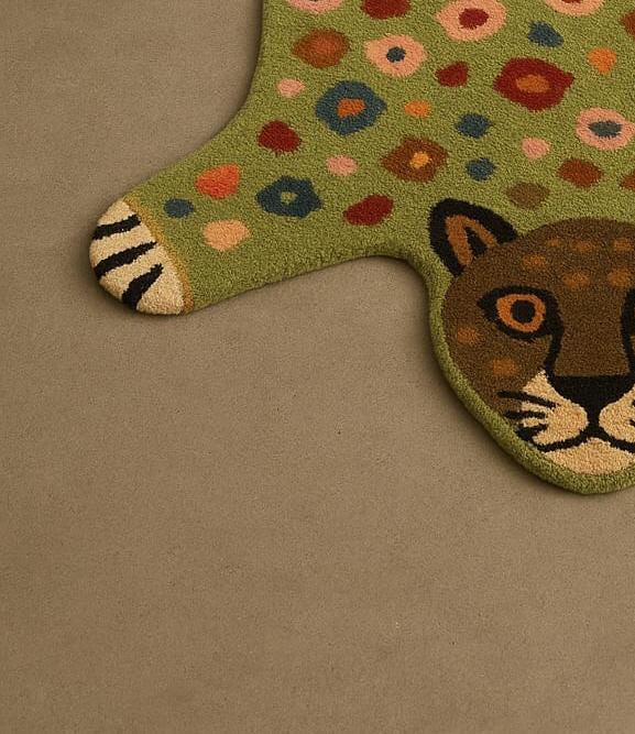 Bring charm and character to your space with this beautiful hand-tufted animal rug. Designed in a cute leopard shape with colorful dotted patterns, this rug adds warmth, softness, and a fun artistic touch to any room.
