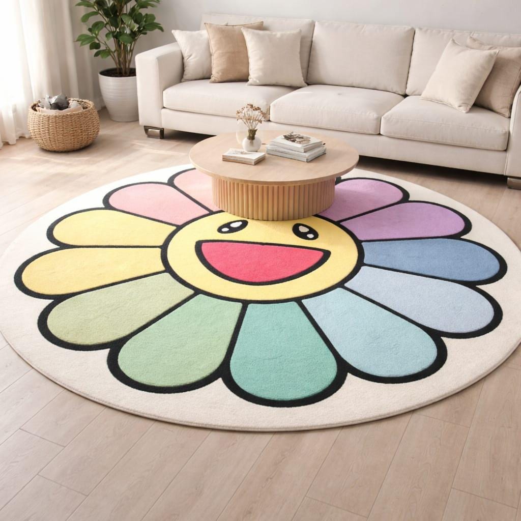 Bring joy and personality to your space with this handmade smiley flower round rug. This colorful hand tufted rug is crafted by skilled artisans using premium quality wool, making it soft, durable, and perfect for modern interiors. Designed with a playful flower face and vibrant pastel petals, this rug instantly becomes a statement piece for living rooms, bedrooms, kids’ rooms, or creative spaces. The round shape adds a unique designer touch that works beautifully under a coffee table or as a centerpiece rug. ✨ Product Details: • Technique: 100% Hand Tufted • Material: Premium Wool • Shape: Round • Design: Smiley Flower / Abstract Art • Feel: Soft, thick & comfortable underfoot • Backing: Strong cotton backing for durability ✨ Customization Available: We accept custom sizes, colors, and bulk or wholesale orders. Perfect for home décor, interior designers, boutiques, and hotels. ✨ Why You’ll Love It: ✔ Handmade by experienced carpet artisans ✔ Eye-catching modern & playful design ✔ Long-lasting, easy to maintain ✔ Unique gift idea for home lovers 📦 Carefully packed and shipped worldwide. Note: Colors may slightly vary due to lighting and screen settings.