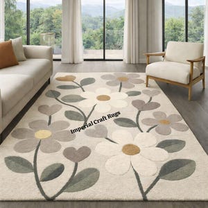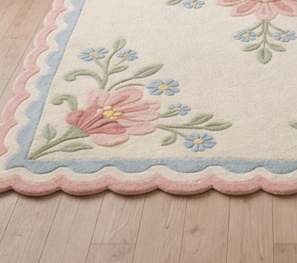 Add timeless elegance and soft charm to your home with this hand-tufted floral wool rug, crafted with care using 100% premium wool. Featuring a delicate pastel flower pattern and a beautiful scalloped edge border, this rug brings warmth, comfort, and a vintage-inspired look to any space. Perfect for living rooms, bedrooms, nurseries, and cozy seating areas, this rug blends effortlessly with modern, farmhouse, and classic interiors. ✨ Product Details ✔️ Material: 100% Natural Wool ✔️ Technique: Hand Tufted ✔️ Design: Floral Pattern with Scalloped Border ✔️ Pile Height: Soft & Plush (Comfort Underfoot) ✔️ Color Palette: Cream Base with Pastel Pink, Blue & Green ✔️ Backing: Cotton / Canvas (Durable & Long-Lasting) ✔️ Customization: Sizes & colors available on request 🏡 Perfect For Living Room Bedroom Nursery / Kids Room Farmhouse & Vintage Decor Cottagecore & Pastel Interiors 🧼 Care Instructions Vacuum regularly (low suction) Spot clean with mild detergent Professional cleaning recommended ✨ Each rug is handcrafted, making every piece unique with slight variations that add to its charm. 📩 Custom orders welcome! Message me for size, color, or design modifications.