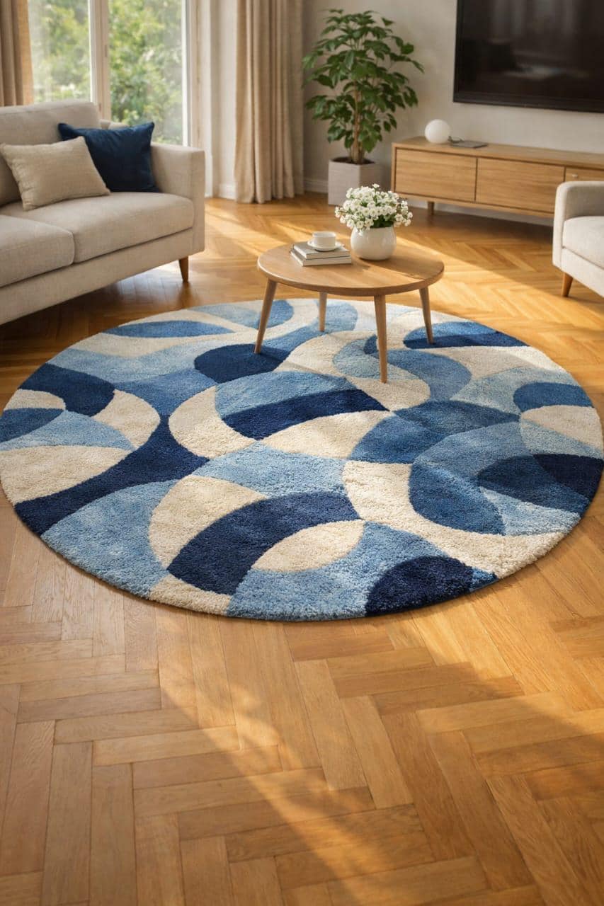 Upgrade your living space with this premium hand tufted wool rug, designed to add warmth, comfort, and modern style to your home. This round abstract rug features a calming blue and ivory pattern that blends perfectly with modern, Scandinavian, and contemporary interiors. 🌿 Why You’ll Love This Rug ✔ 100% Natural Wool – soft, warm, and long-lasting ✔ Hand Tufted Craftsmanship – made by skilled artisans ✔ Thick & Plush Pile – comfortable underfoot ✔ Modern Abstract Design – perfect for stylish homes ✔ Durable & Easy to Maintain 🏡 Perfect For Living Room Bedroom Sitting Area Apartment & Modern Homes Coffee Table & Center Area 📏 Size 3 x 5 Feet (Custom sizes available on request) 🎨 Color Blue, Light Blue & Ivory (Colors may slightly vary due to lighting and screen settings) 🧼 Care Instructions Vacuum regularly (no beater bar) Spot clean with mild detergent Do not machine wash ✨ Custom Orders Available Want a different size, color, or shape? Feel free to message us for a custom handmade rug made just for you.